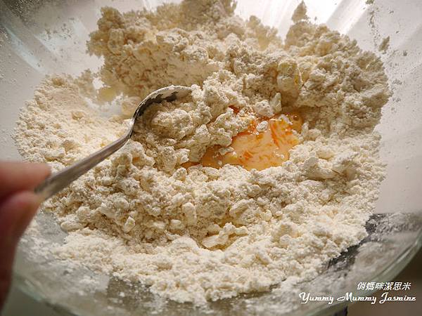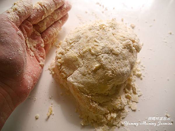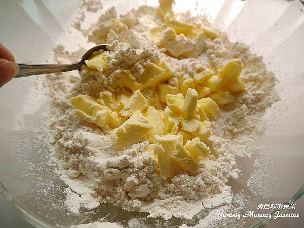 3. 接著用手輕搓,不要碰到奶油體,讓粉包覆著奶油不停地越搓越小,直到所有的奶油幾乎都變成像泥土的質地。
