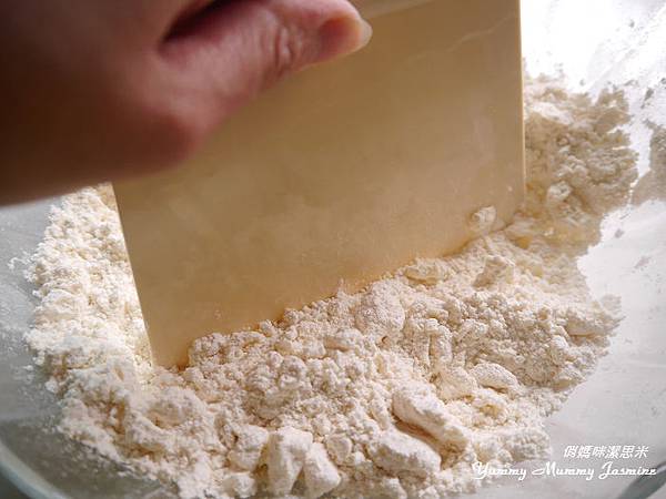 2. 用刮版或是小刀片將奶油和粉類混合。