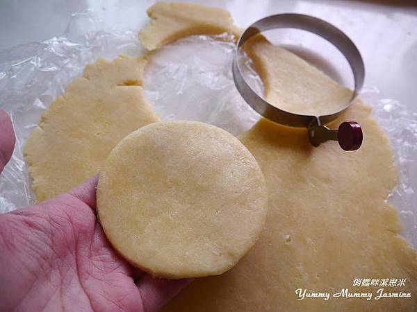 9.使用比模具還大的壓模圈(在這裡我用的是煮荷包蛋的小工具),壓出塔皮。