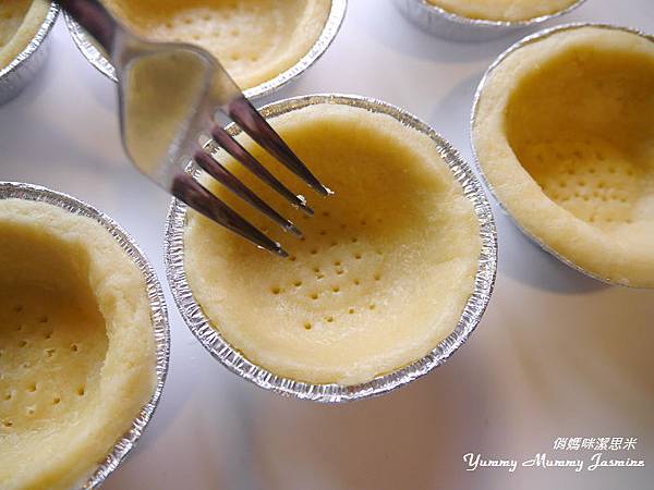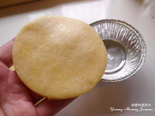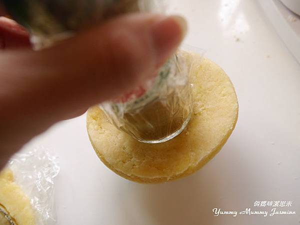 10.鋪在塔模上,用調味罐頭輕壓出整齊的內餡圓形。(調味罐要包保鮮膜比較衛生喔~),塔皮周圍要稍微壓一下緊貼模具。因為等等烘烤會回縮喔~