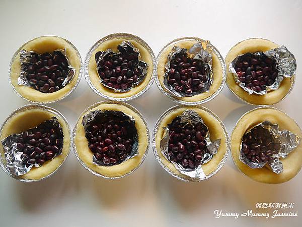 12.鋪上鋁箔紙或是烘焙紙,放上豆類或是派石。
