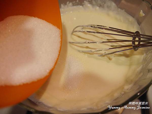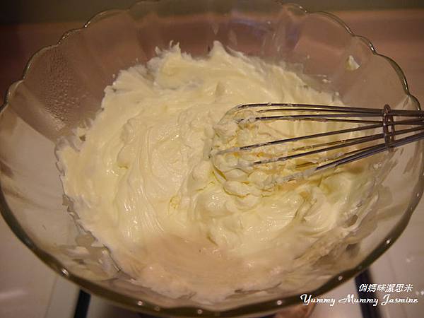 14。內餡製作->將馬士卡彭,奶油乳酪,鮮奶油,砂糖隔水加熱融化。